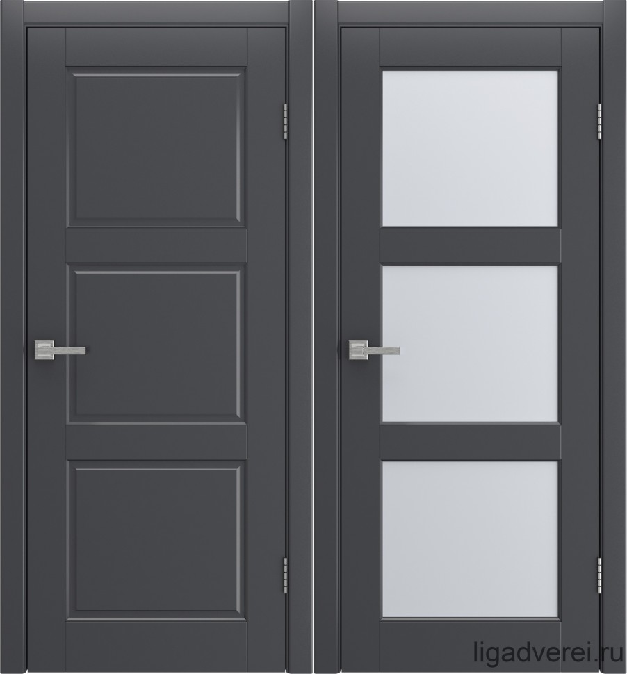 Дверь Манхэттен-3 ДО имеет каркасно-щитовую конструкцию с фрезерованной поверхностью полотна, имитирующей филенки. Модель остеклена светлым или темным сатинатом на выбор и покрыта эмалью.